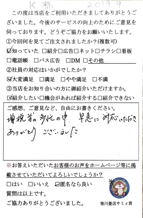■お客様の声(K様) 2019.10.01 ダイケン和紙表、若草色。畳縁も若草色をお選びいただきました。満足して頂き大変嬉しいです。 お客様の声(K様)増税前の多忙の中、早急に対応いただきありがとうございました。